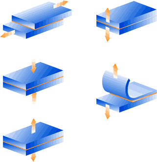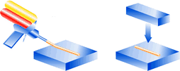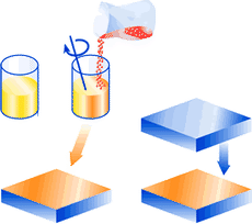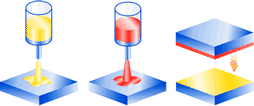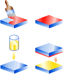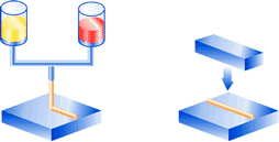![]() | Klasyczny system A/B. Składniki kleju są rozprowadzane na każdej powierzchni osobno, a następnie całość składana razem. Reakcja utwardzania zachodzi dopiero w momencie zetknięcia obu powierzchni. | ||